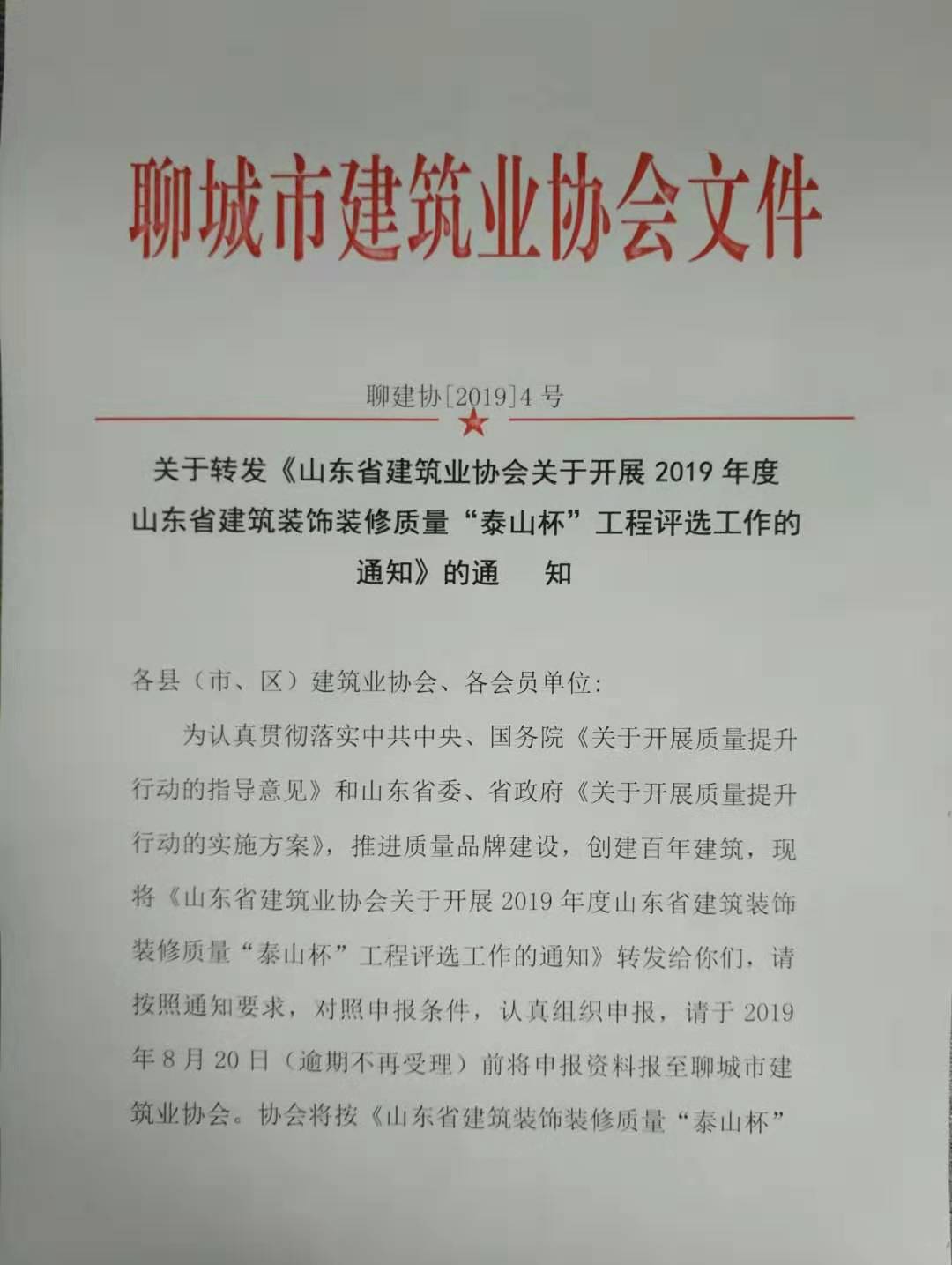 關(guān)于轉(zhuǎn)發(fā)《山東省建筑業(yè)協(xié)會(huì)關(guān)于開展2019年度山東省建筑裝飾裝修 質(zhì)量“泰山杯”工程評(píng)選工作的通知》的通知
