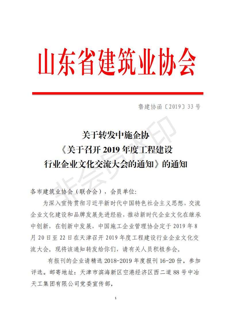 附件:中施企協(xié)《關(guān)于召開 2019 年度工程建設(shè)行業(yè)企業(yè)文 化交流大會(huì)的通知》.zip