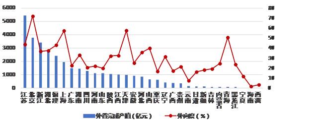 圖4 2019年上半年各地區(qū)跨省完成的建筑業(yè)總產值及外向度