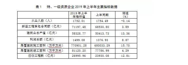 住房和城鄉(xiāng)建設部匯總的6552個特、一級資質建筑業(yè)企業(yè)2019年上半年主要指標數據如下(表1)。