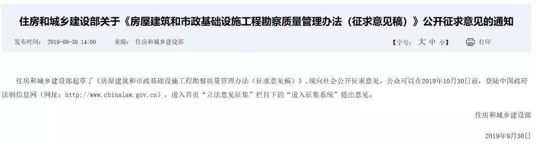 住房和城鄉(xiāng)建設(shè)部起草了《房屋建筑和市政基礎(chǔ)設(shè)施工程勘察質(zhì)量管理辦法(征求意見稿)》,現(xiàn)向社會(huì)公開征求意見。公眾可以在2019年10月30日前,登陸中國(guó)政府法制信息網(wǎng)(網(wǎng)址:http://www.chinalaw.gov.cn),進(jìn)入首頁(yè)“立法意見征集”欄目下的“進(jìn)入征集系統(tǒng)”提出意見。住房和城鄉(xiāng)建設(shè)部2019年9月30日《房屋建筑和市政基礎(chǔ)設(shè)施工程勘察質(zhì)量管理辦法(征求意見稿)》第一章 總則第一條 為了加強(qiáng)對(duì)房屋建筑和市政基礎(chǔ)設(shè)施工程勘察質(zhì)量的管理,保證工程勘察質(zhì)量,根據(jù)《中華人民共和國(guó)建筑法》《建設(shè)工程勘察設(shè)計(jì)管理?xiàng)l例》《建設(shè)工程質(zhì)量管理?xiàng)l例》《建設(shè)工程安全生產(chǎn)管理?xiàng)l例》等有關(guān)法律、法規(guī),制定本辦法。第二條 在中華人民共和國(guó)境內(nèi)從事房屋建筑和市政基礎(chǔ)設(shè)施工程(以下簡(jiǎn)稱“工程”)勘察活動(dòng)的,應(yīng)遵守本辦法。本辦法所稱勘察,是指根據(jù)工程要求,查明、分析、評(píng)價(jià)建設(shè)場(chǎng)地的地質(zhì)、環(huán)境特征和巖土工程條件,并提出合理技術(shù)建議,編制工程勘察文件的活動(dòng)。本辦法所稱工程勘察文件,主要包括勘察綱要、勘察報(bào)告等文件。第三條 建設(shè)單位、勘察單位及相關(guān)人員應(yīng)依法對(duì)工程勘察質(zhì)量負(fù)責(zé)。第四條 國(guó)務(wù)院住房和城鄉(xiāng)建設(shè)主管部門負(fù)責(zé)全國(guó)工程勘察質(zhì)量活動(dòng)的監(jiān)督管理。縣級(jí)以上地方人民政府住房和城鄉(xiāng)建設(shè)主管部門對(duì)本行政區(qū)域內(nèi)的工程勘察質(zhì)量實(shí)施監(jiān)督管理。第五條 工程勘察行業(yè)相關(guān)社會(huì)團(tuán)體應(yīng)完善行業(yè)約束與懲戒機(jī)制,加強(qiáng)行業(yè)自律,維護(hù)公平競(jìng)爭(zhēng),規(guī)范勘察單位和人員依法從事工程勘察活動(dòng)。第六條 鼓勵(lì)采用先進(jìn)技術(shù)、工藝、設(shè)備、材料和管理方法,提高工程勘察質(zhì)量水平。第二章 責(zé)任和義務(wù)第七條 建設(shè)單位應(yīng)依法與勘察單位簽訂勘察合同,明確勘察任務(wù)要求、工期、費(fèi)用以及各自的質(zhì)量責(zé)任義務(wù)。第八條 建設(shè)單位應(yīng)為勘察工作提供必要的現(xiàn)場(chǎng)工作條件。在勘察工作開展前,提供有關(guān)批準(zhǔn)文件,勘察場(chǎng)地地形圖、地下管線及設(shè)施分布圖等與工程勘察有關(guān)的前期資料,并對(duì)資料的真實(shí)性、準(zhǔn)確性、完整性負(fù)責(zé)。第九條 建設(shè)單位應(yīng)加強(qiáng)履約管理,及時(shí)足額支付勘察費(fèi)用。建設(shè)單位可委托具有勘察資質(zhì)的第三方單位提供勘察質(zhì)量管理服務(wù)。建設(shè)單位應(yīng)按規(guī)定將工程勘察文件送施工圖審查機(jī)構(gòu)審查。建設(shè)單位應(yīng)組織勘察單位向設(shè)計(jì)單位、施工單位和監(jiān)理單位進(jìn)行勘察技術(shù)交底。在基坑隱蔽前及時(shí)組織勘察單位、設(shè)計(jì)單位、施工單位、監(jiān)理單位等開展施工驗(yàn)槽。第十條 勘察單位必須依法取得工程勘察資質(zhì)證書,并在資質(zhì)等級(jí)許可的范圍內(nèi)承接勘察業(yè)務(wù)。勘察單位應(yīng)按照有關(guān)法律法規(guī)、工程建設(shè)強(qiáng)制性標(biāo)準(zhǔn)、勘察合同及勘察任務(wù)要求開展勘察工作,編制工程勘察文件,并對(duì)工程勘察文件的真實(shí)性、準(zhǔn)確性和完整性負(fù)責(zé)。工程勘察文件的編制深度應(yīng)符合國(guó)家規(guī)定的要求。第十一條 勘察單位應(yīng)按照有關(guān)規(guī)定,建立健全勘察質(zhì)量管理制度并確保有效運(yùn)行。第十二條 勘察單位有權(quán)向建設(shè)單位提出保證工程勘察質(zhì)量所必需的現(xiàn)場(chǎng)工作條件、合理技術(shù)要求和合理工期。第十三條 勘察單位應(yīng)在勘探作業(yè)前向作業(yè)人員進(jìn)行交底。勘察單位應(yīng)嚴(yán)格執(zhí)行勘察綱要和勘察操作規(guī)程,采取措施保證各類管線、設(shè)施和周邊建筑物、構(gòu)筑物的安全,并做好安全記錄。第十四條 勘察單位應(yīng)按照規(guī)范要求對(duì)試驗(yàn)樣品的取樣、密封、送樣、保管、試驗(yàn)進(jìn)行管理。第十五條 勘察單位應(yīng)保證工程勘察工作原始記錄的真實(shí)和準(zhǔn)確,并應(yīng)在勘察過程中及時(shí)整理、核對(duì),嚴(yán)禁離開現(xiàn)場(chǎng)追記或者補(bǔ)記。項(xiàng)目負(fù)責(zé)人或其授權(quán)人員應(yīng)及時(shí)對(duì)原始記錄進(jìn)行驗(yàn)收簽字。鼓勵(lì)勘察單位采用信息化手段,實(shí)時(shí)采集、記錄、存儲(chǔ)工程勘察數(shù)據(jù)。鼓勵(lì)勘察單位采用影像等方式對(duì)鉆探、取樣、原位測(cè)試、室內(nèi)試驗(yàn)等主要過程進(jìn)行記錄。勘察單位在原始記錄中不得存在下列情形:(一)紙質(zhì)原始記錄與電子存儲(chǔ)記錄不一致的;(二)試驗(yàn)、測(cè)試報(bào)告與試驗(yàn)、測(cè)試的過程記錄資料不符的;(三)未按規(guī)定記錄原始數(shù)據(jù)的;(四)各類記錄和報(bào)告的時(shí)間與原始記錄和報(bào)