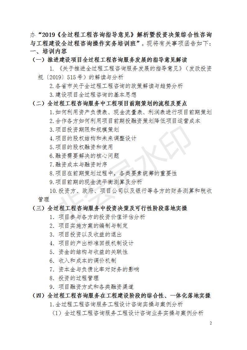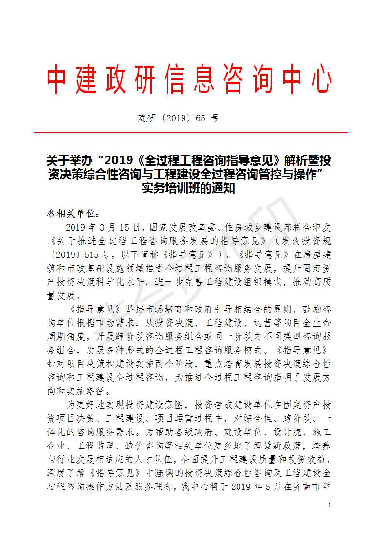 關(guān)于舉辦“2019《全過程工程咨詢指導(dǎo)意見》解析暨投資決策綜合性咨詢與工程建設(shè)全過程咨詢管控與操作”實務(wù)培訓(xùn)班的通知