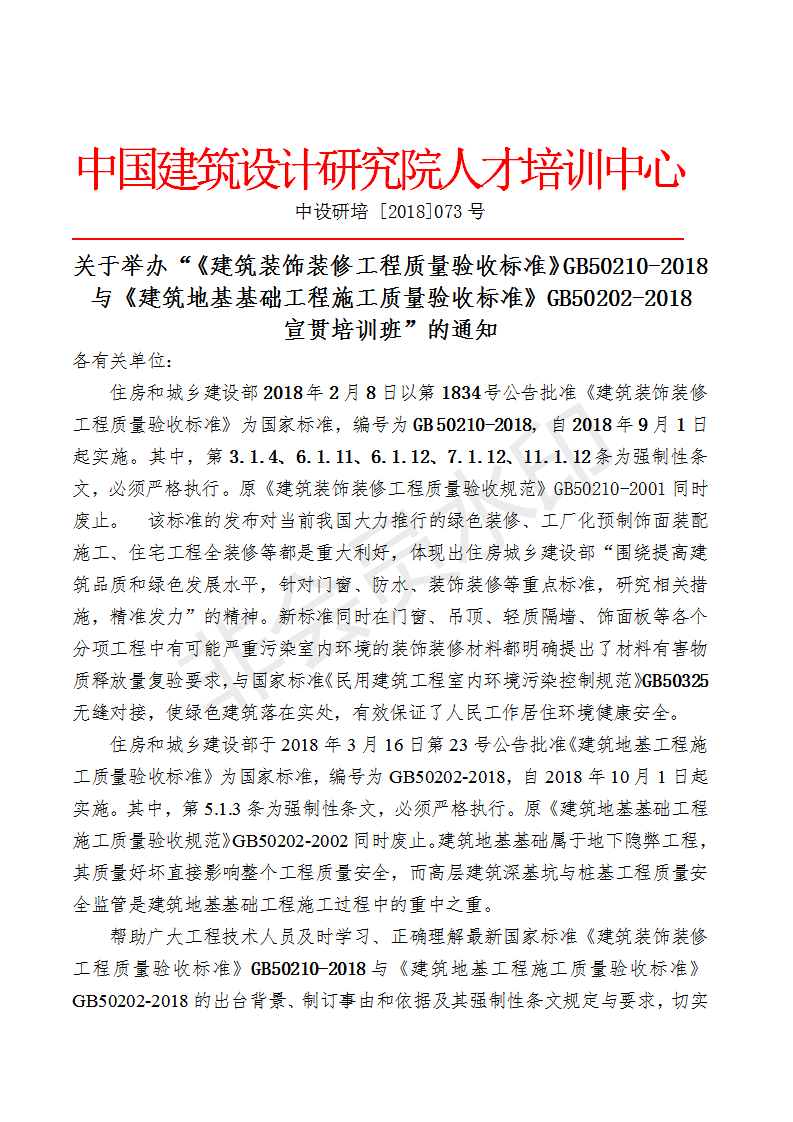 關(guān)于舉辦“《建筑裝飾裝修工程質(zhì)量驗(yàn)收標(biāo)準(zhǔn)》GB50210-2018與《建筑地基基礎(chǔ)工程施工質(zhì)量驗(yàn)收標(biāo)準(zhǔn)》GB50202-2018宣貫培訓(xùn)班”的通知